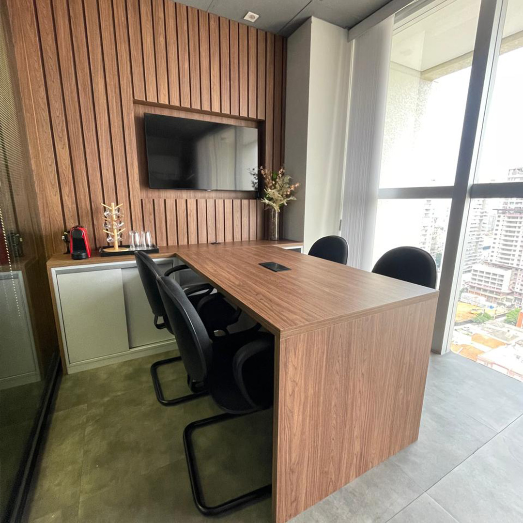 - No lounge que já era composto com poltronas e cafeteira, recebeu um painel em marcenaria com infraestrutura para TV e Vídeo Game para momentos de pausa dos colaboradores.
